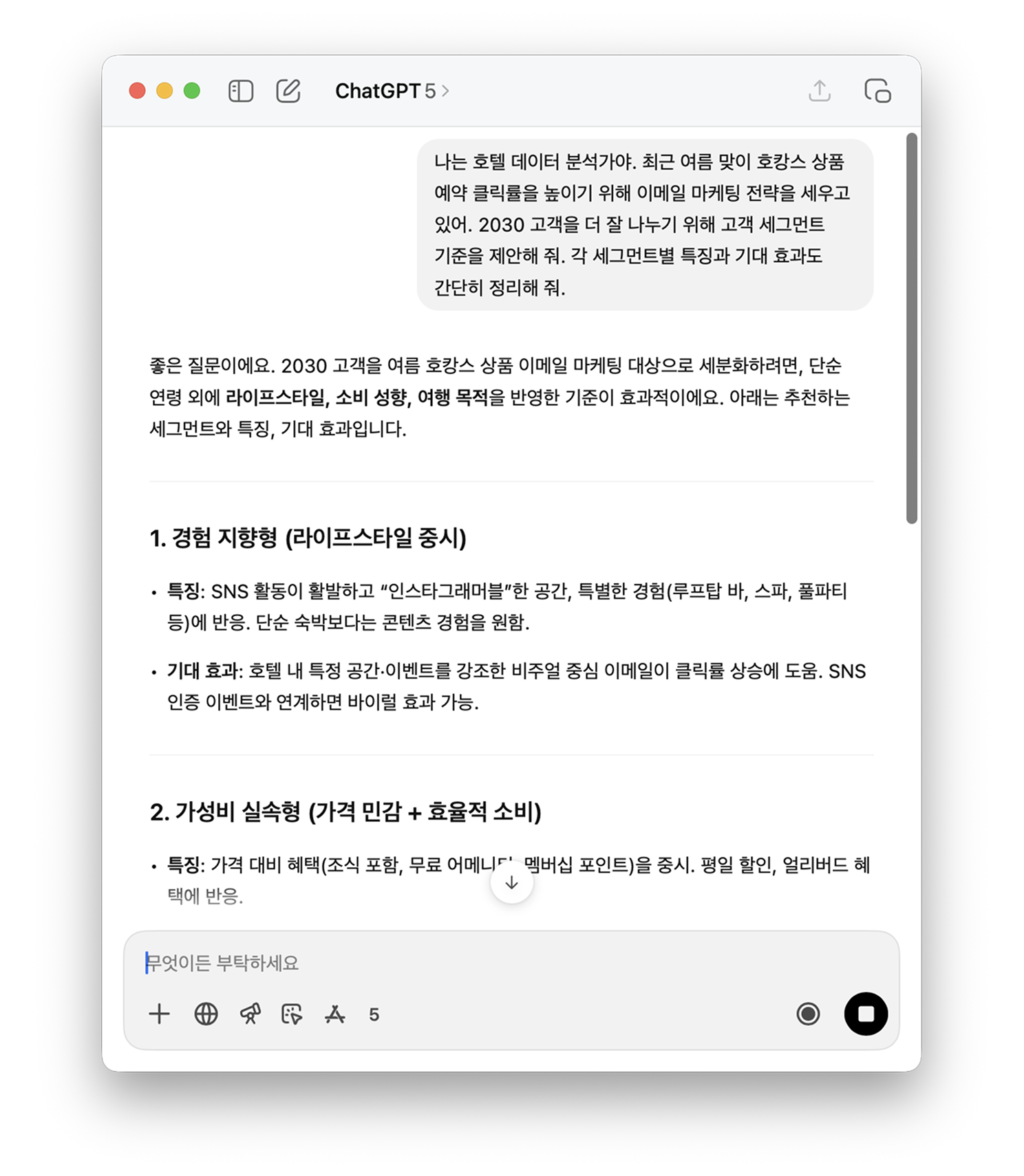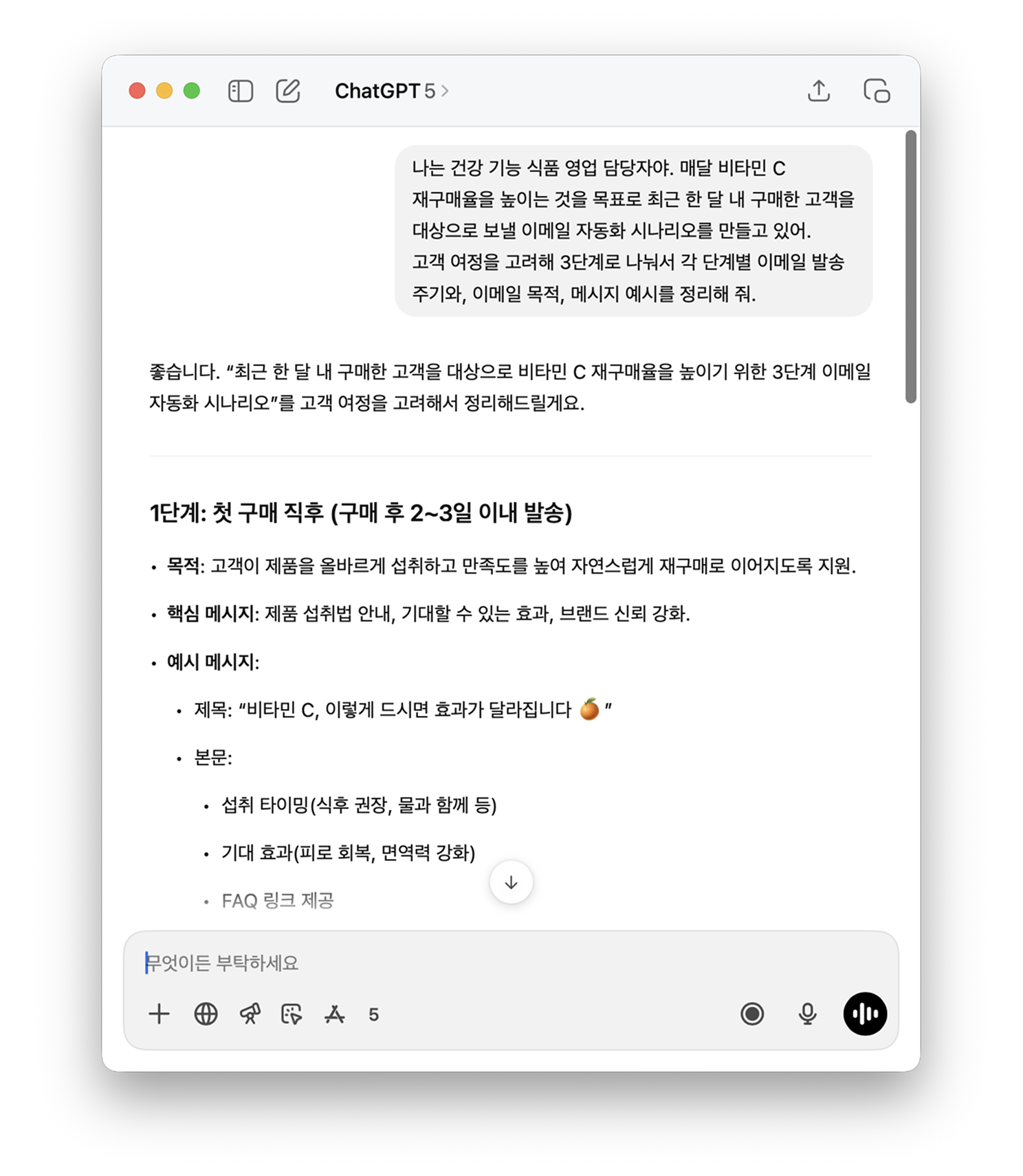 데이터 분석으로 인사이트를 도출했다면, 이제 이메일 마케팅 성과 지표를 향상하기 위한 구체적인 전략이 필요합니다. 구독자를 어떤 기준으로 세분화할지, 언제, 얼마나 자주 발송할지, 본문 길이나 구성은 어떻게 최적화할지를 AI와 함께 고민해 보세요. |