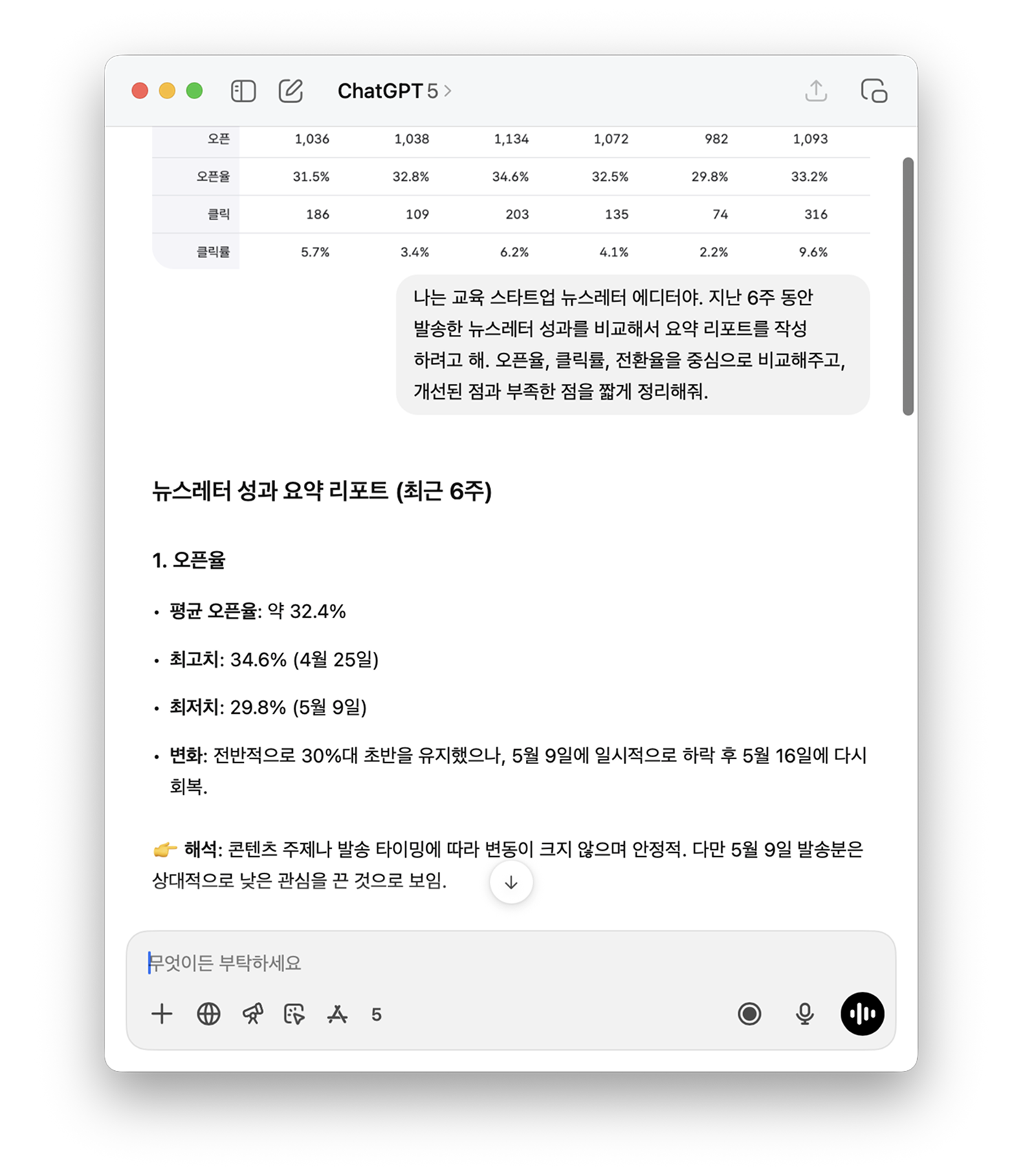 데이터 분석 단계의 프롬프트를 작성할 때는 지난 뉴스레터의 데이터 알려주어야 추상적이지 않은 답변을 받을 수 있습니다. 스티비의 통계 화면을 캡처해 첨부하거나 지난 뉴스레터의 발송 성과 데이터를 CSV 파일로 내려받아 첨부해 보세요. 또는 직접 프롬프트에 작성해 포함시켜도 좋습니다. |