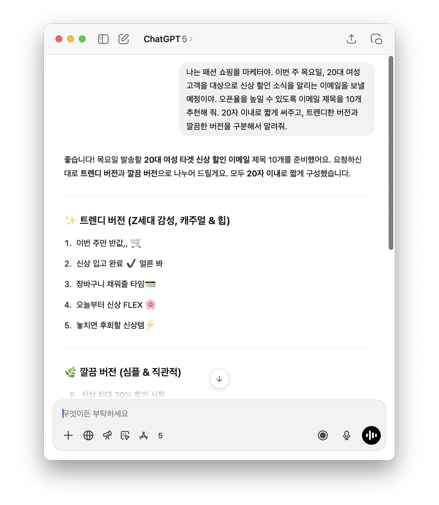클릭률을 높이는 CTA 문구 작성이나, 브랜드 톤 앤 매너에 맞춘 본문 다듬기에도 AI를 활용할 수 있습니다. 브랜드 가이드 문서가 있다면 첨부하여 AI가 참고하도록 하는 것도 좋은 방법입니다. |