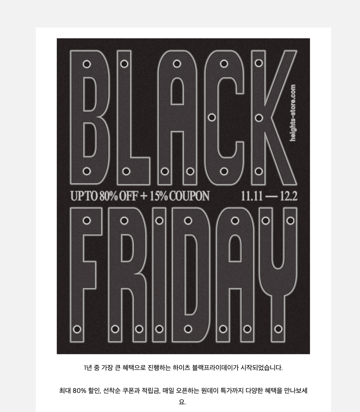 예를 들어, 하이츠는 이메일 제목과 본문의 배너 등에서 할인 기간과 할인율을 명확하게 강조합니다. 덕분에 고객은 이메일 전문을 읽지 않아도 받을 수 있는 혜택을 한 눈에 확인할 수 있습니다. 또한 고객이 이메일을 읽다 제품에 관심이 생기면 바로 구매로 전환될 수 있도록, 이메일 곳곳에 CTA 버튼을 반복적으로 배치하는 전략을 활용했습니다.
