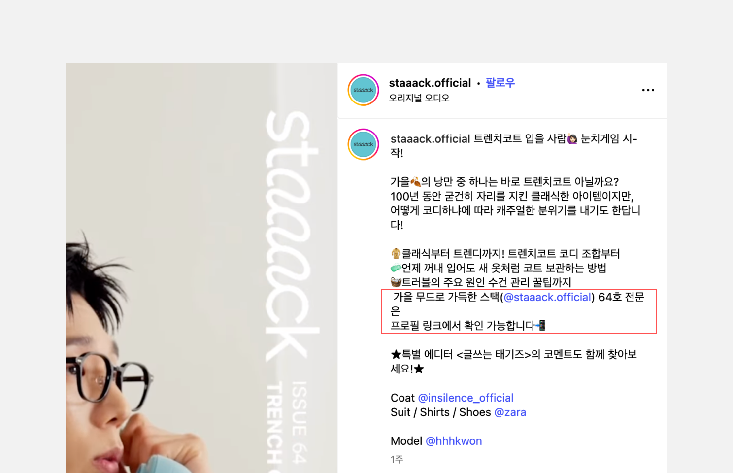 패션에 대해 이야기하는 <스택>은 '트렌치코트'를 주제로 삼아, 인스타그램에는 팔로워들의 관심을 끌 릴스를 업로드하고 자세한 내용은 뉴스레터로 풀어냈습니다. 구독은 인스타그램 프로필 링크를 활용했죠. 뉴스레터에는 트렌치코트의 어원부터 여러 종류, 인플루언서의 스타일링 팁 및 세탁, 관리 방법까지 자세히 담겨있습니다.