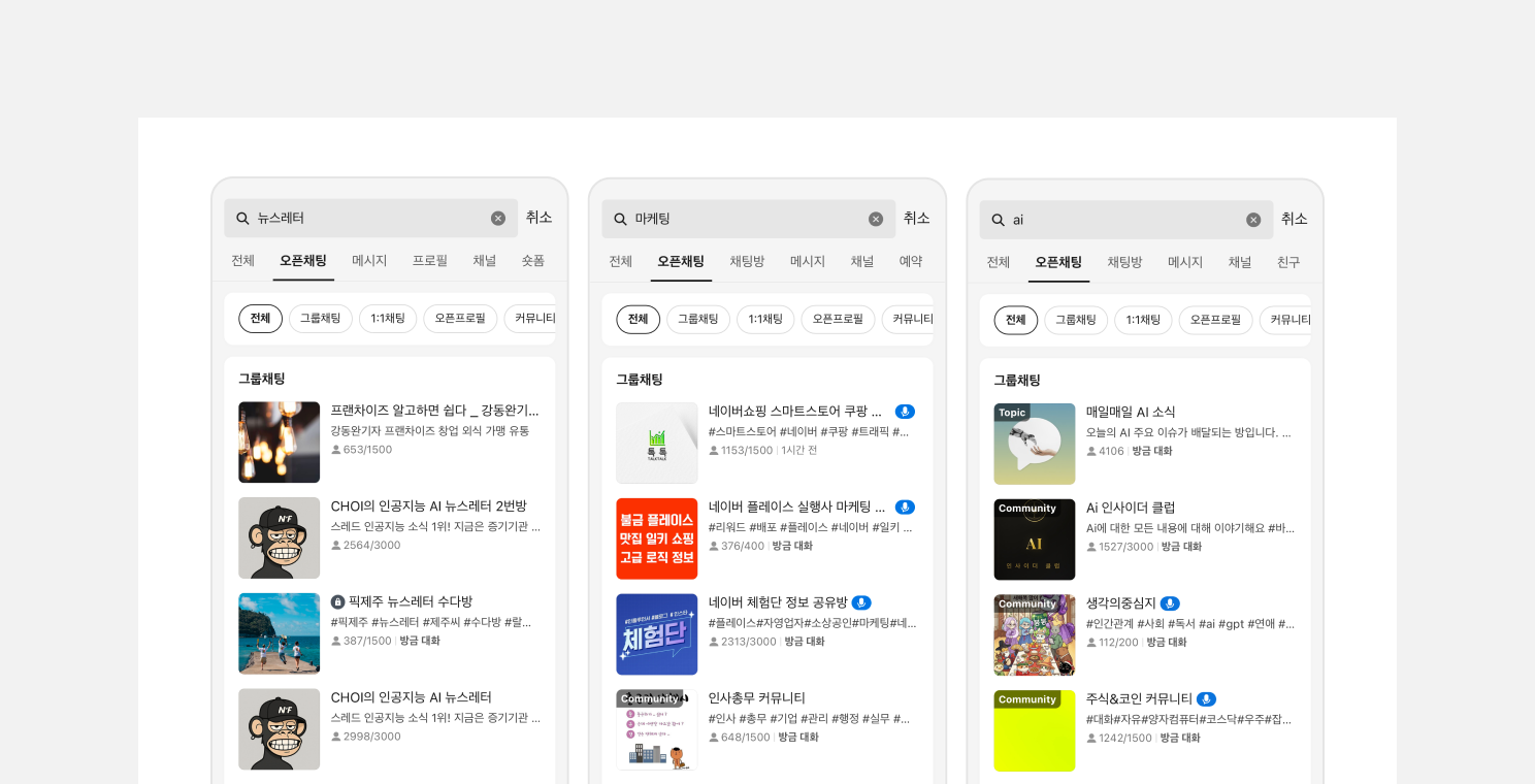 카카오톡 오픈채팅방은 반응을 바로 확인할 수 있는 공간입니다. 같은 관심사를 가진 사람들이 모여 트렌드를 빠르게 공유하고, 여러 명이 동시에 대화를 이어갑니다. 콘텐츠를 올리면 곧바로 질문이 달리고, 의견이 더해집니다. 마케터는 고객의 반응을 실시간으로 확인하고 대응할 수 있습니다. 링크 하나가 빠르게 퍼지고, 대화 속에서 새로운 주제가 등장하기도 합니다. 콘텐츠에 대한 고객의 온도를 가장 가까이에서 확인할 수 있습니다. |